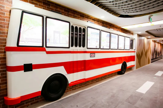 由高铁复兴号时代列车场景和 B1 层小吃街四条长廊“电车文化、公交文化、地铁文化和出租车文化”组成的“百年公交”主题街区,可以一起追忆童年 和感受上海百年公交的历史。